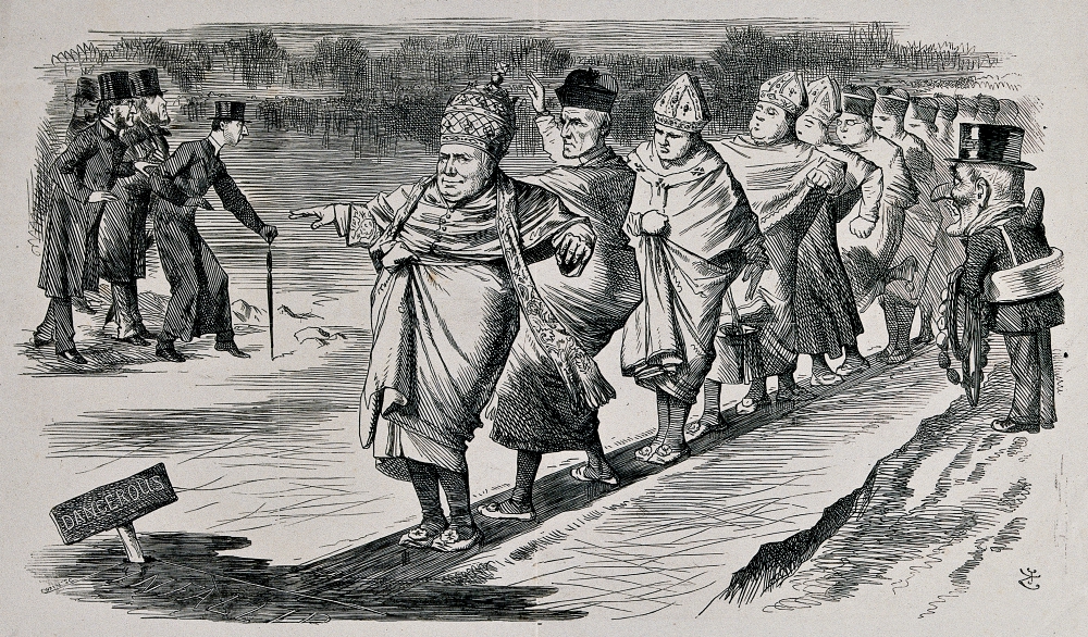First Vatican Council, 1869-1870: Pope Pius IX leading his cardinals across a plank of wood placed on the ice, watched by Mr Punch.;
