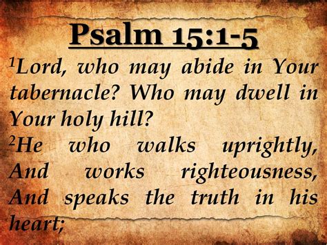 This morning I chose to look at Psalm 15:1-5. (1) LORD, who may abide in Your tabernacle? Who may dwell in Your holy hill? (2) He who walks uprightly, And works righteousness, And speaks the truth in his heart; (3) He who does not backbite with his tongue, Nor does evil to his neighbor, Nor does he take up a reproach against his friend; (4) In whose eyes a vile person is despised, But he honors those who fear the LORD; He who swears to his own hurt and does not change; (5) He who does not put out his money at usury, Nor does he take a bribe against the innocent. He who does these things shall never be moved.