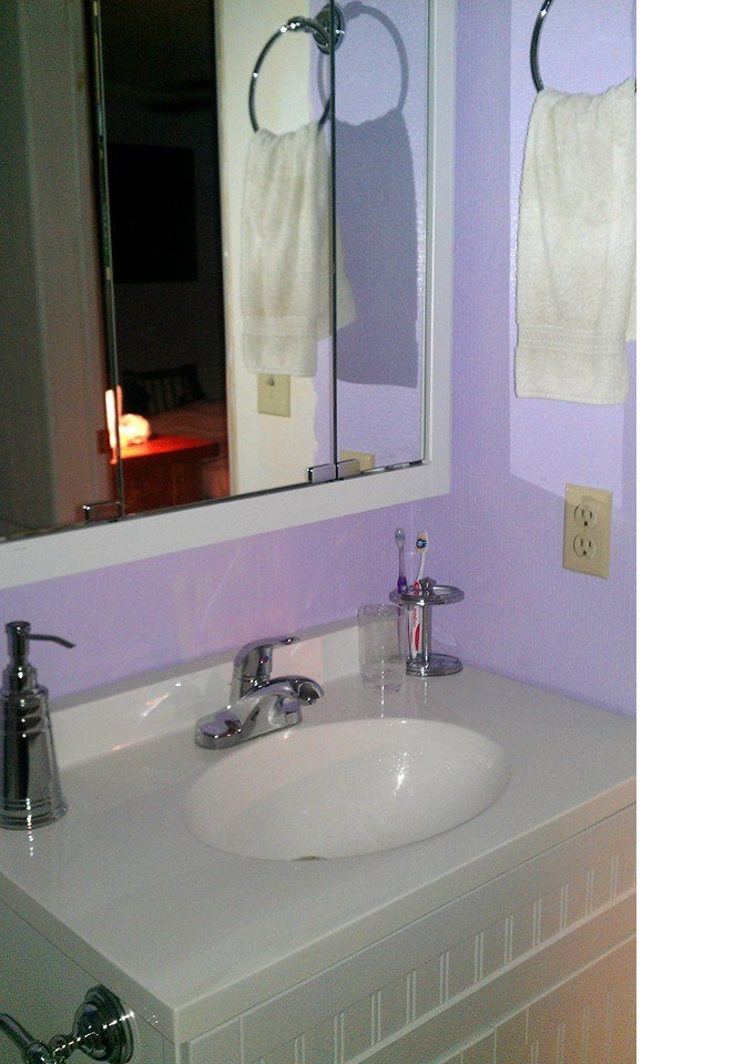 She bought tile for the floor, so my next step was to pull up flooring and brace the joistsBath vanity more to support the tile. Once I put down the floor tile she was right behind me with grout. Not to stop her now, she wanted a toilet that was a little taller and I wanted one with a more efficient use of water. We found it and while at it why not go ahead and get a new vanity with drawers on one side. Now the bathroom is coming together with color. The shades of earth tones have come together in the shower and on the floor. The wainscot and chair rail are white with the same color applying to the toilet, vanity and medicine cabinet. The walls are now a purple pastel. It has such a clean refreshing look.